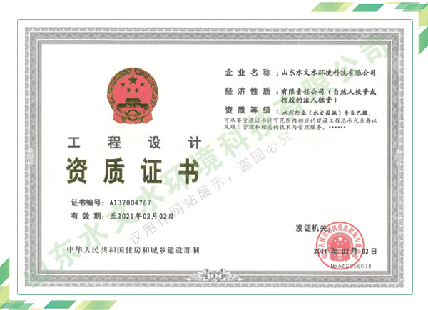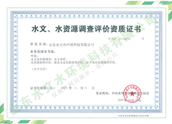 公司擁有水利工程設(shè)計、水土保持、水文水資源調(diào)查評價、水資源論證、建設(shè)項目環(huán)境影響評價、市政公用工程施工總承包、水利水電工程施工總承包、電子與智能化工程專業(yè)承包等資質(zhì),2017年通過質(zhì)量管理體系、環(huán)境管理體系、職業(yè)健康安全管理體系認(rèn)證;2020年被評為國家級高新技術(shù)企業(yè),同年被中國水利企業(yè)協(xié)會推薦為第一批“合同節(jié)水服務(wù)企業(yè)”;2021年被山東省、濟(jì)南市評為 “專精特新”中小企業(yè)。業(yè)務(wù)范圍涉及水利工程設(shè)計;節(jié)水設(shè)計、改造、水平衡測試;山洪災(zāi)害調(diào)查;城市水資源調(diào)查評價;建設(shè)項目水土保持方案編制、監(jiān)測、驗收、水土保持規(guī)劃;水安全保障規(guī)劃、建設(shè)項目水資源論證、規(guī)劃水資源論證;建設(shè)項目環(huán)境影響評價;入河排污口論證;防洪影響評價;市政公用工程施工、水利水電工程施工、電子與智能化工程施工等。
